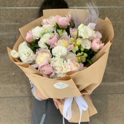 Букет из гортензии, пионов, пионовидной розы, эустомы и роз в стильной упаковке “Американ Роад”