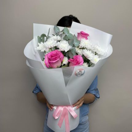 Композиция в коробке из белой кустовой хризантемы, кустовой розы и рафаэлло