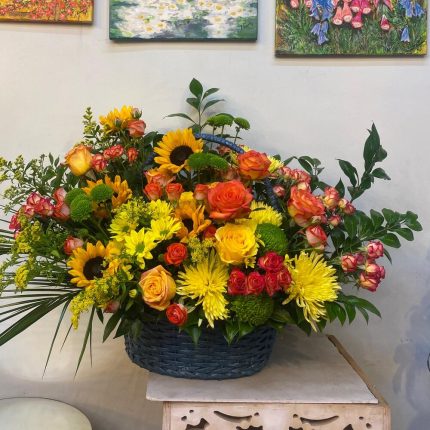 Букет из гортензии, гвоздик, гиперикума, эустомы, роз, эвкалипта и фисташки в плетеной корзине “Ариадна”