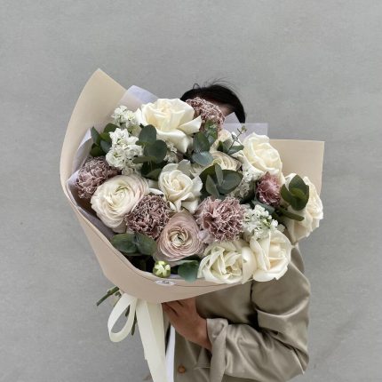 Букет из 11 фиолетовых маттиол и фисташки в стильной упаковке “Вайолет”