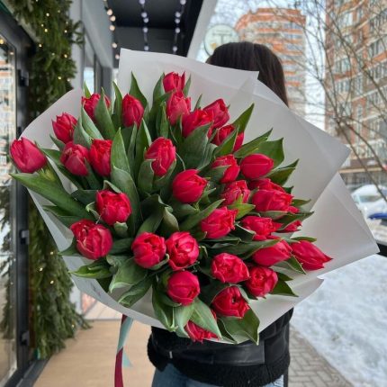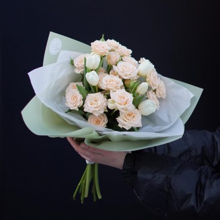 Шляпная коробка гортензией, пионами, эустомой, тюльпанами, гиацинтами, фрезией и гвоздикой “Джоанна”