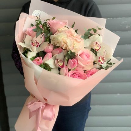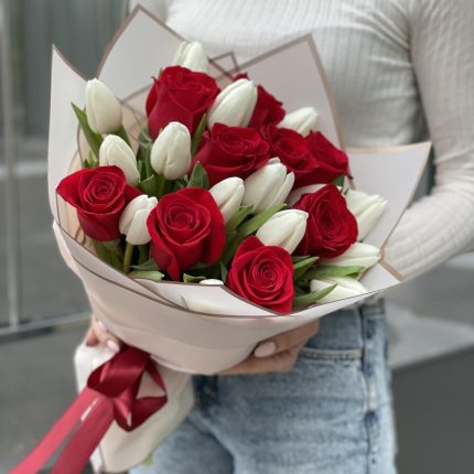 Весенняя композиция в корзине с тюльпанами и ромашками с элементами декора
