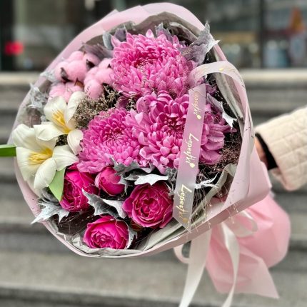 Букет с тюльпанами, герберами, альстромерией и хризантемой ромашка «Ванильная весна»