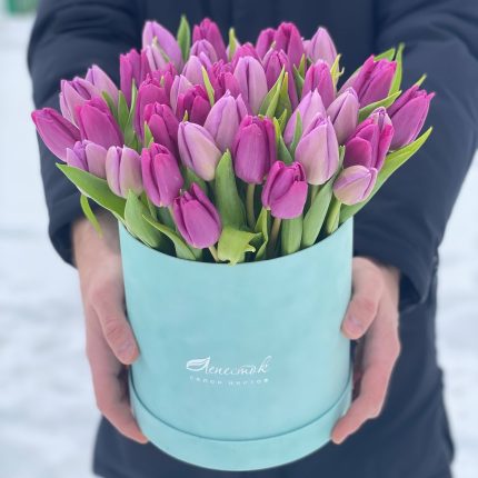 Клубнично-банановый, весенний букет с тюльпанами, нарциссами и ранункулюсами