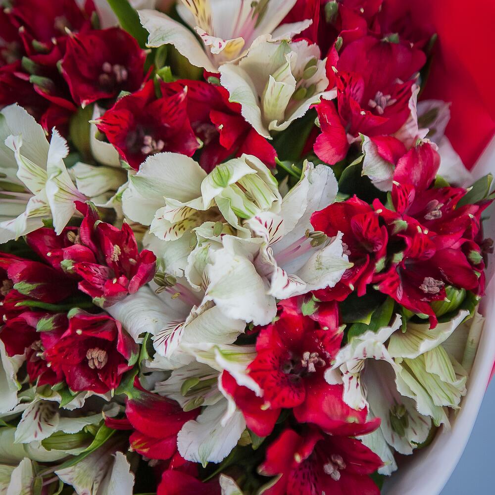 альстромерия красные – 8 шт.альстромерия белые – 7 шт.Упаковка крафт – 1 шт.Атласная лента – 1 шт.