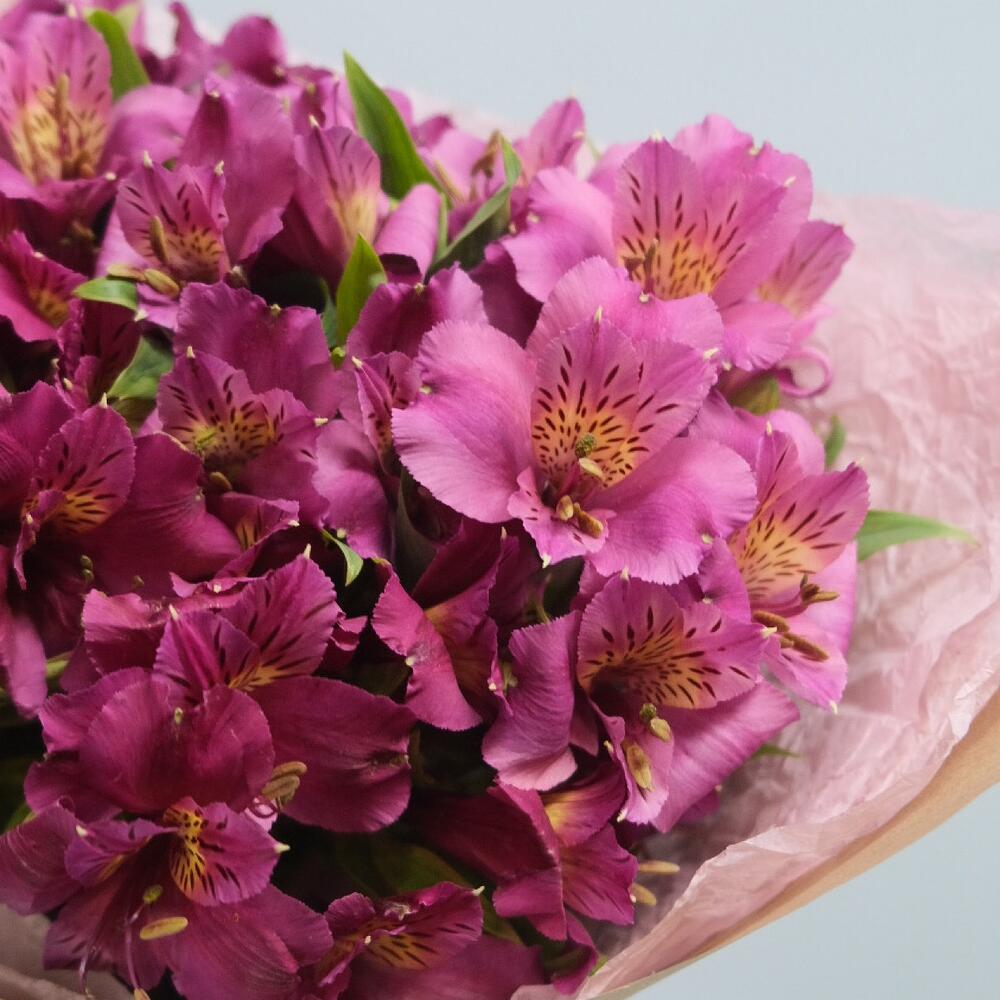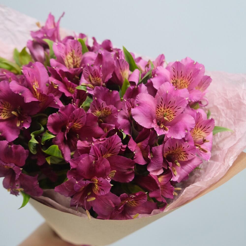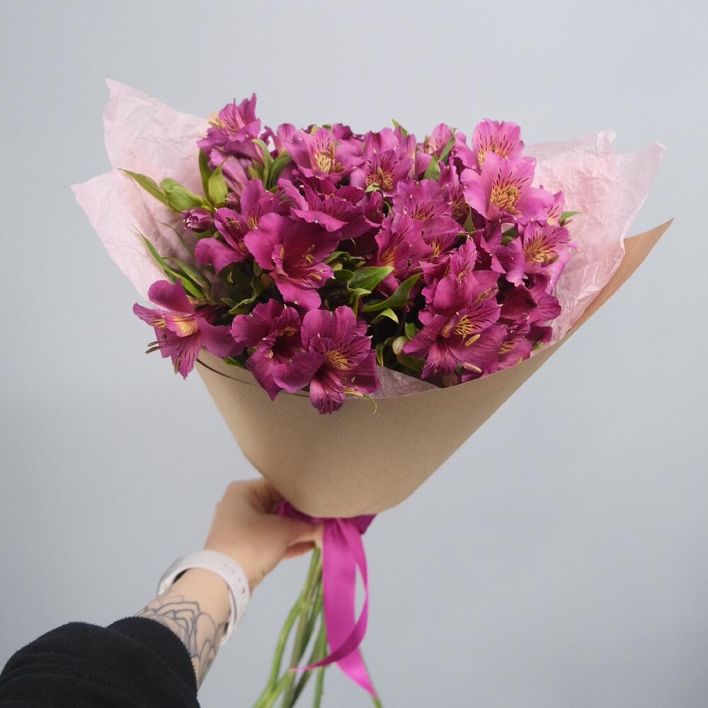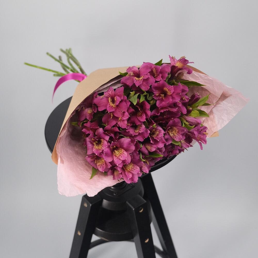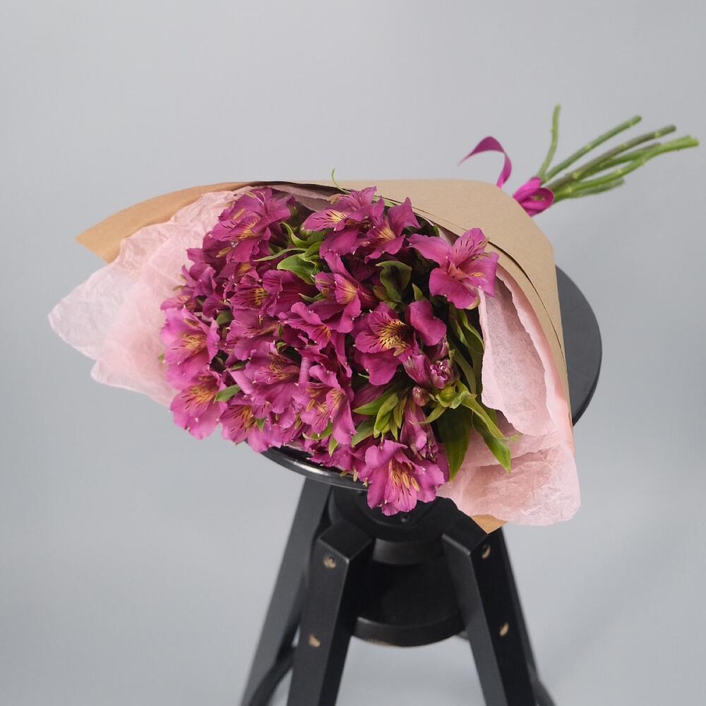 Альстромерия розовая – 7 шт.розовая тишью – 1 шт.крафтовая бумага – 1 шт.Атласная лента – 1 шт.