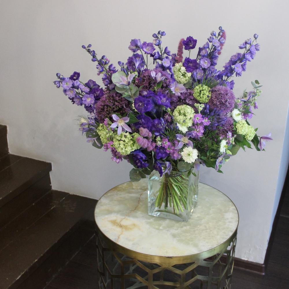 Аллиум – 5 шт.Маттиола – 9 шт.Вибурнум – 5 шт.Клематис – 5 шт.Нигелла – 5 шт.Дельфиниум – 7 шт.Агапантус – 3 шт.Эвкалипт – 11 шт.Лента атласная – 2 шт.Фисташка – 3 шт.
