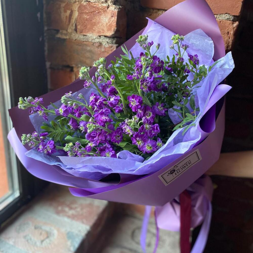 Букет из 11 фиолетовых маттиол и фисташки в стильной упаковке “Вайолет”