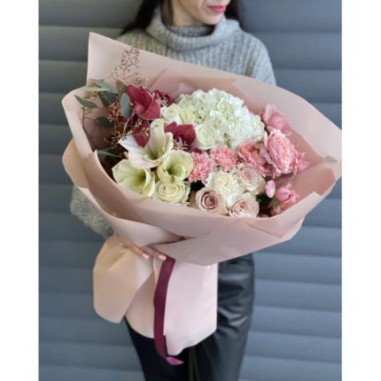 евкаліпт – 5 шт. троянда спрей піоні баблз – 3 шт. гортензія рожева – 1 шт. троянда сілва пінк екстра – 5 шт. пірʼя декоративне – 3 шт. фірмове оформлення букета – 1 шт. рідина для букета у вазу – 1 шт.
