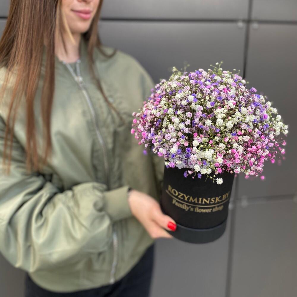 В коробку вставляется мокрая губка (оазис)- а в губку вставляется гипсофила.
