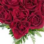 Composition in the form of heart from the single-headed red roses framed with fern. It is not necessary for the vase, because the roses are in floral oasis and get the necessary water out of it