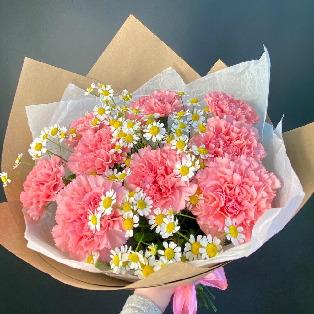 Крафт упаковка – 1 шт.Тишью белое – 2 шт.ромашка матрикария танацетум – 3 шт.диантус розовый (гвоздика ) – 9 шт.зелень декоративная фисташка ветка – 1 шт.