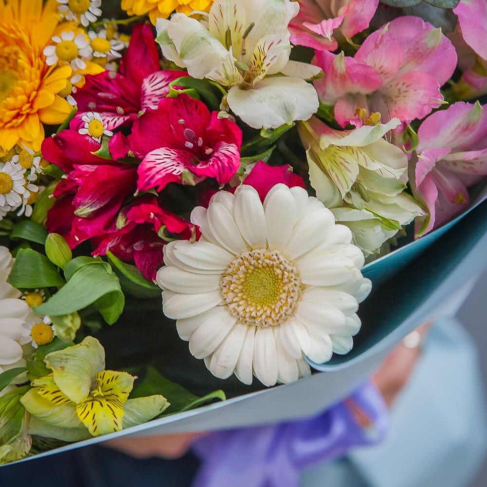 Гербера белая – 4 шт.Гербера красная – 2 шт.Гербера желтая – 2 шт.Эвкалипт – 4 шт.Матрикария – 4 шт.Альстромерия красная – 2 шт.Альстромерия желтая – 2 шт.Альстромерия белая – 2 шт.Альстромерия розовая – 2 шт.Альстромерия фиолетовая – 2 шт.