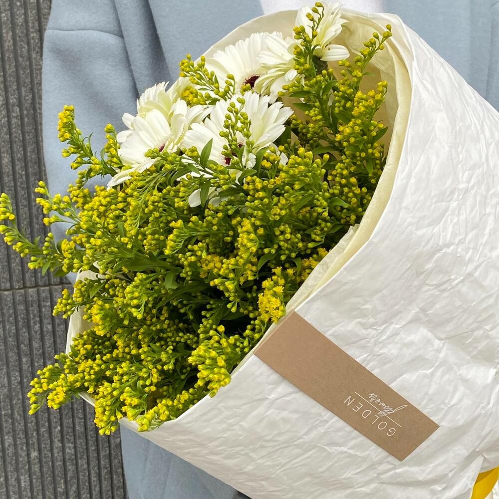 Солидаго – 4 шт.Тишью – 2 шт.Гербера – 7 шт.крафтовая бумага – 1 шт.фирменный транспортировочный пакет – 1 шт.