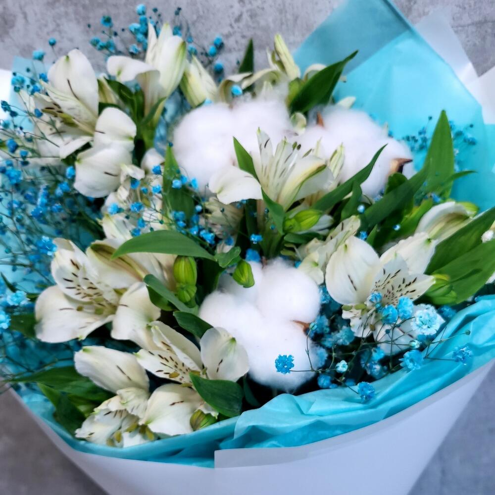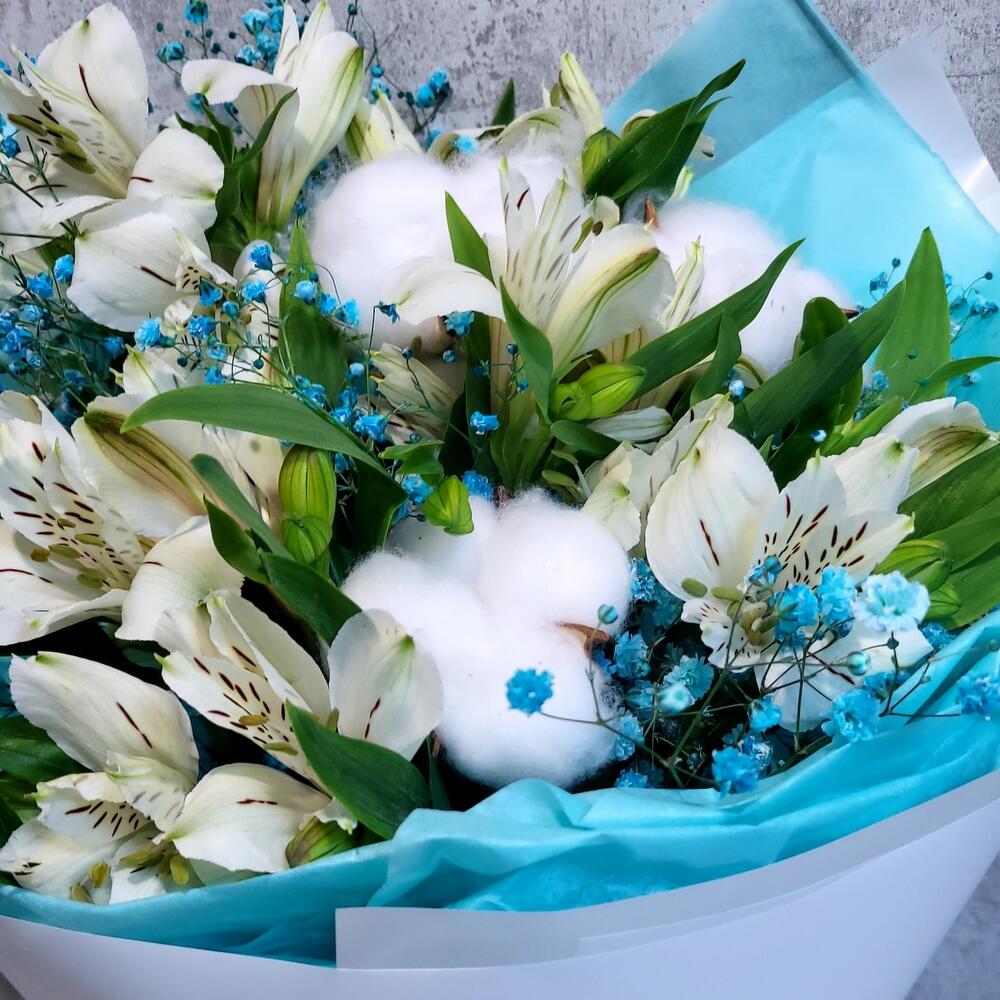 Альстромерия – 5 шт.Гипсофила – 1 шт.Хлопок – 3 шт.Лента атласная – 1 шт.Упаковка дизайнерская – 1 шт.