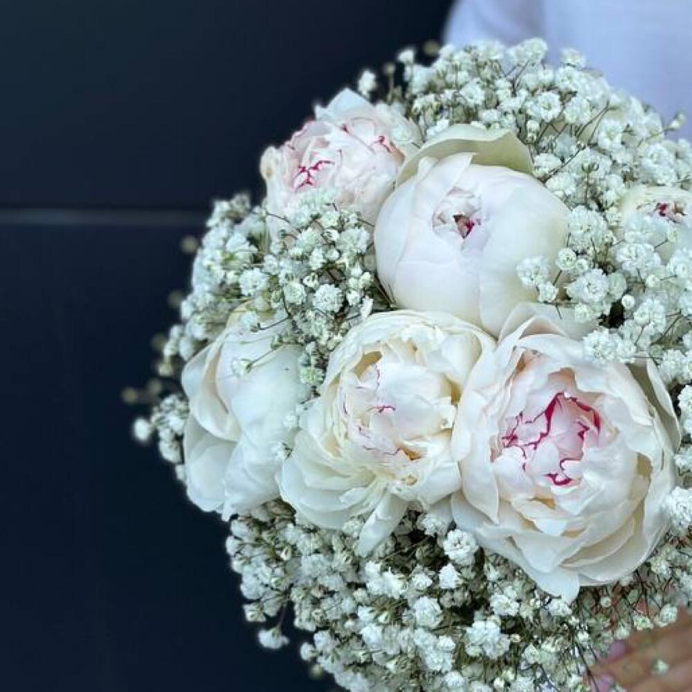 Букет невесты из белых итальянских пионов с гипсофиллой