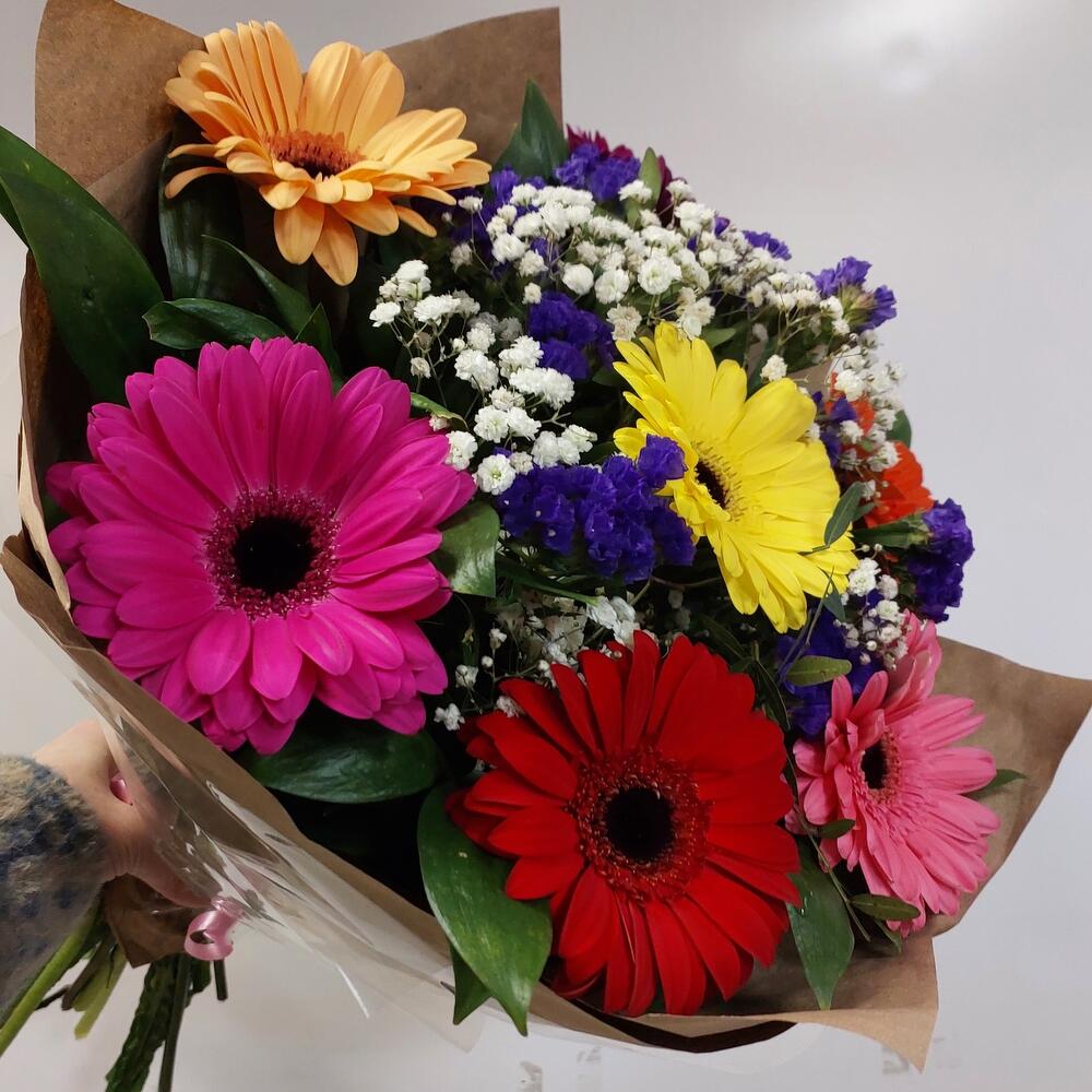 Гербера – 7 шт.Статица – 2 шт.гипсофила радужная – 1 шт.Рускус – 10 шт.Фисташка – 1 шт.Упаковка дизайнерская – 2 шт.Лента – 1 шт.
