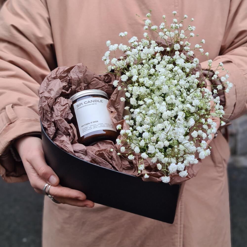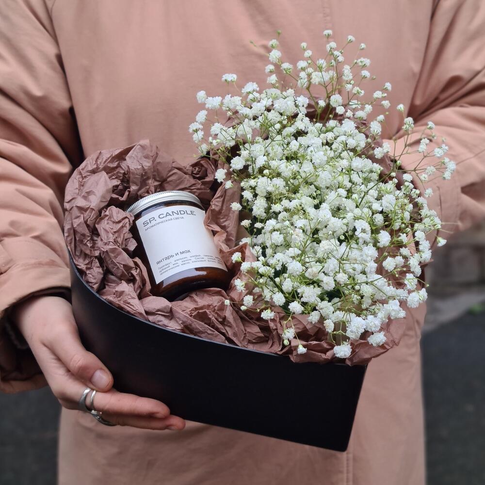 “Атлас☁️” – цветочная композиция с зефиром в деревянном ящике