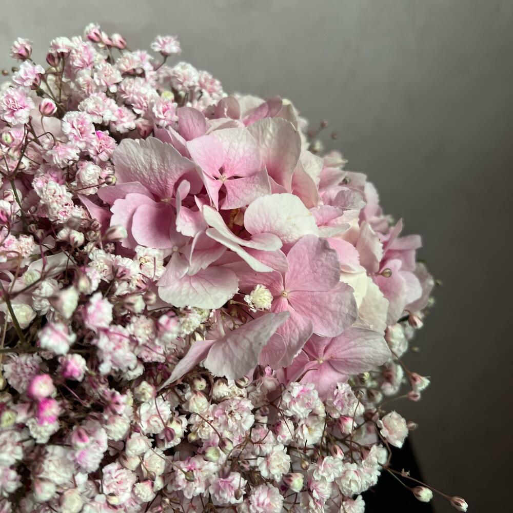 шляпная коробочка l – 1 шт.Флористическая губка (оазис) – 1 шт.Тишью – 1 шт.Атласная лента – 1 шт.Гортензия – 3 шт.Гипсофила – 7 шт.