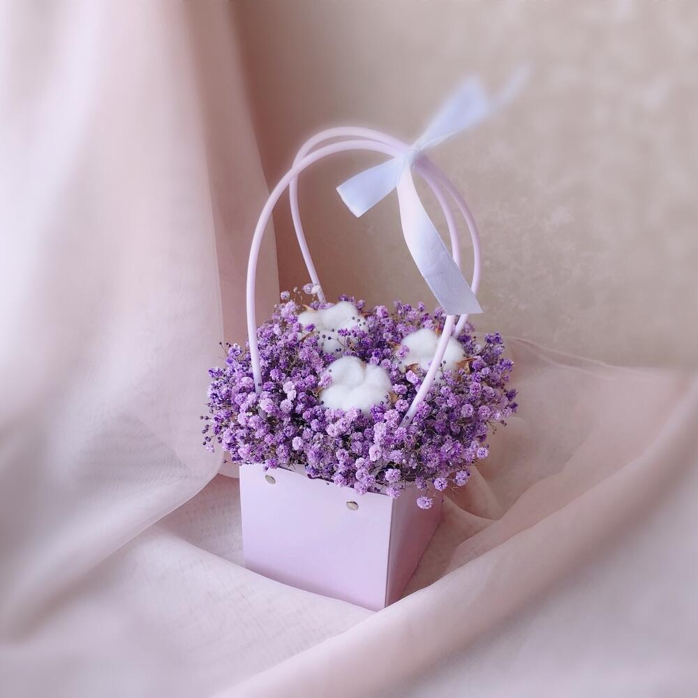 Очаровательная композиция из изысканных свежих цветов.Наполнена множеством соцветий фиолетовой гипсофилы и мягкого хлопка. Собрана в стильной сумочке.Композиция из гипсофилы – необычный подарок, который удивит своей невероятной стойкостью, при правильном и простом уходе.❤️ Ставить композицию в прохладном месте, избегая отопительных приборов и прямых солнечных лучей. ❤️ Подливать немного воды в серединку.Гипсофила не вянет, а становится сухоцветом, сохраняя свой вид. Поэтому композиция продолжит радовать ещё очень долго!Чтобы защитить готовый букет во время доставки от любых погодных условий, мы бережно его упаковываем