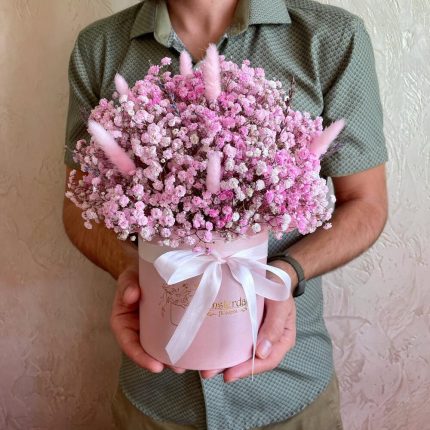 Коробка шляпная – 1 шт. Лагурус – 15 шт. Оазис флористический – 1 шт. гипсофила цветная – 7 шт.