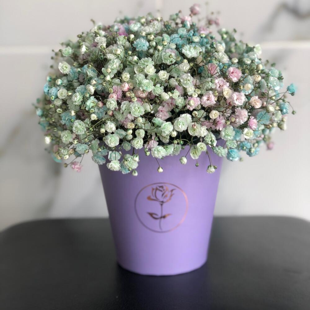 “Сиреневый туман” – композиция из гипсофилы в шляпной коробке