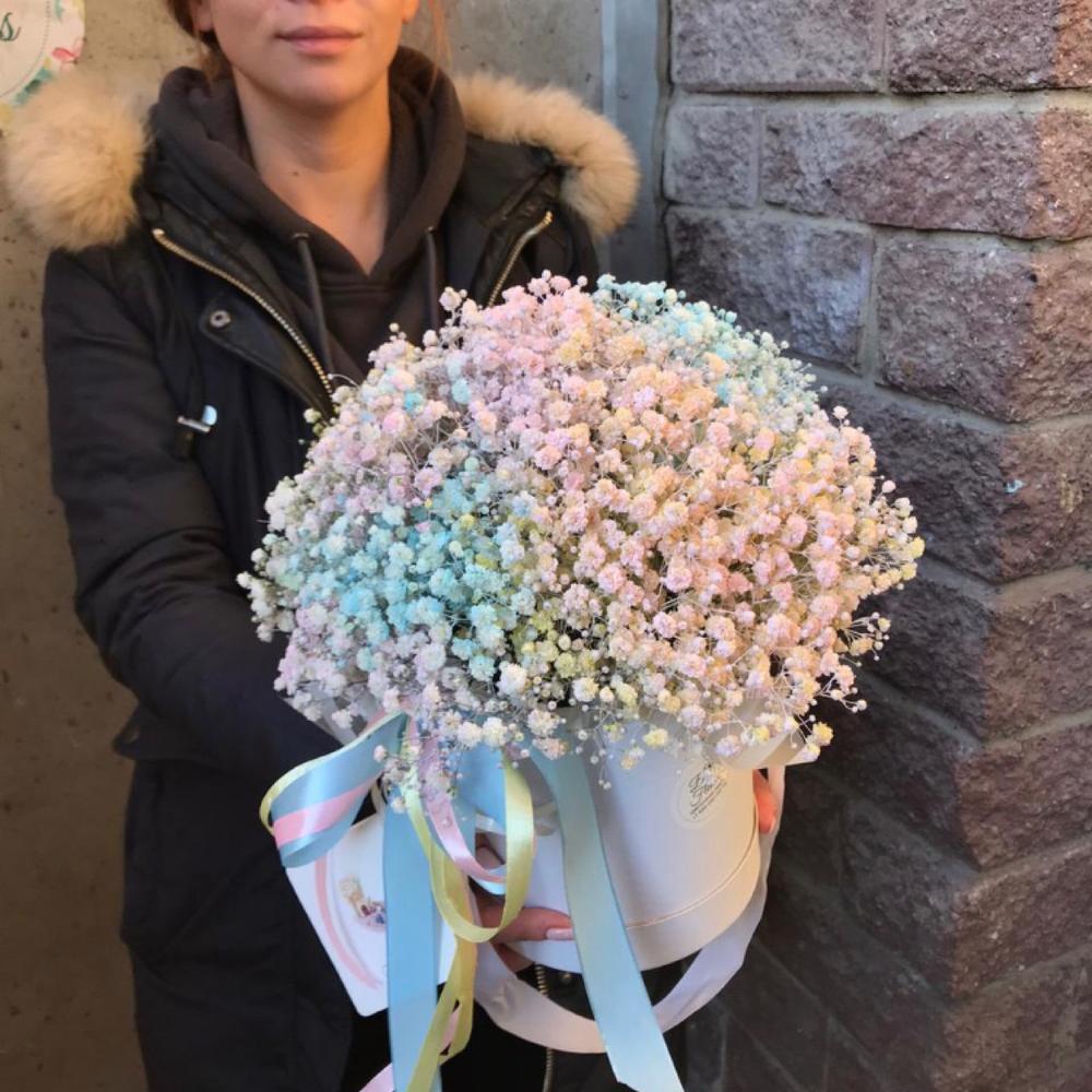 “Сиреневый туман” – композиция из гипсофилы в шляпной коробке