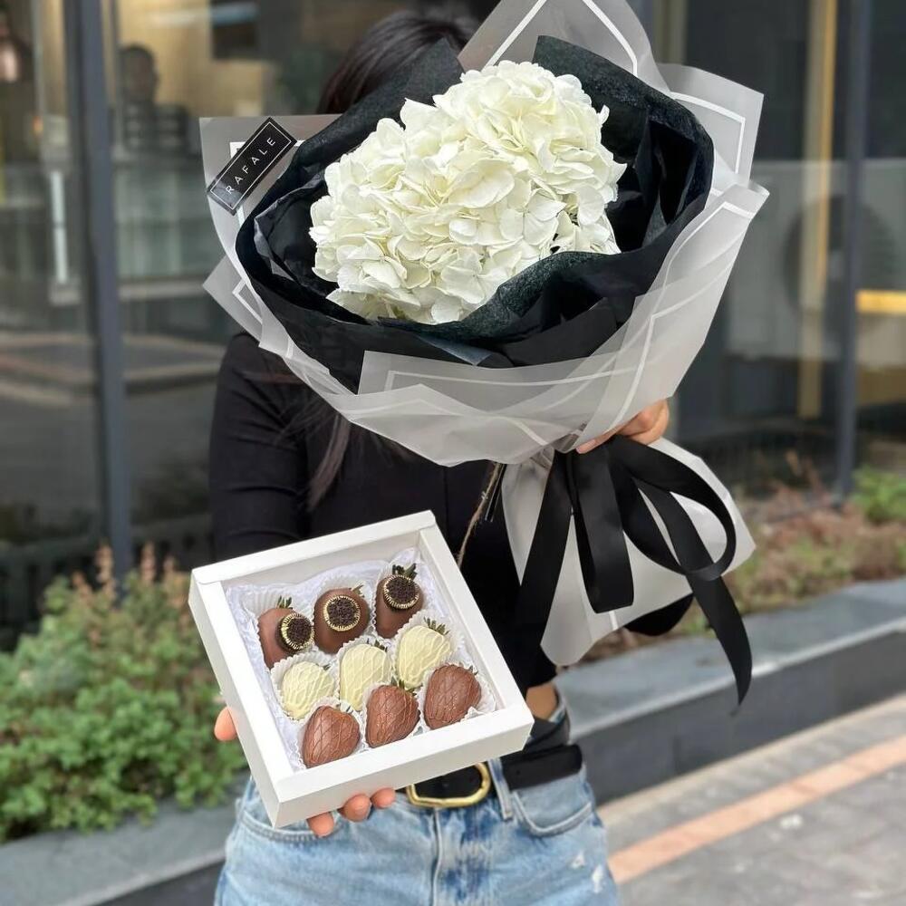 Прекрасный дуэт из клубники в шоколаде и букета гортензии, чтобы порадовать своего близкого человека.