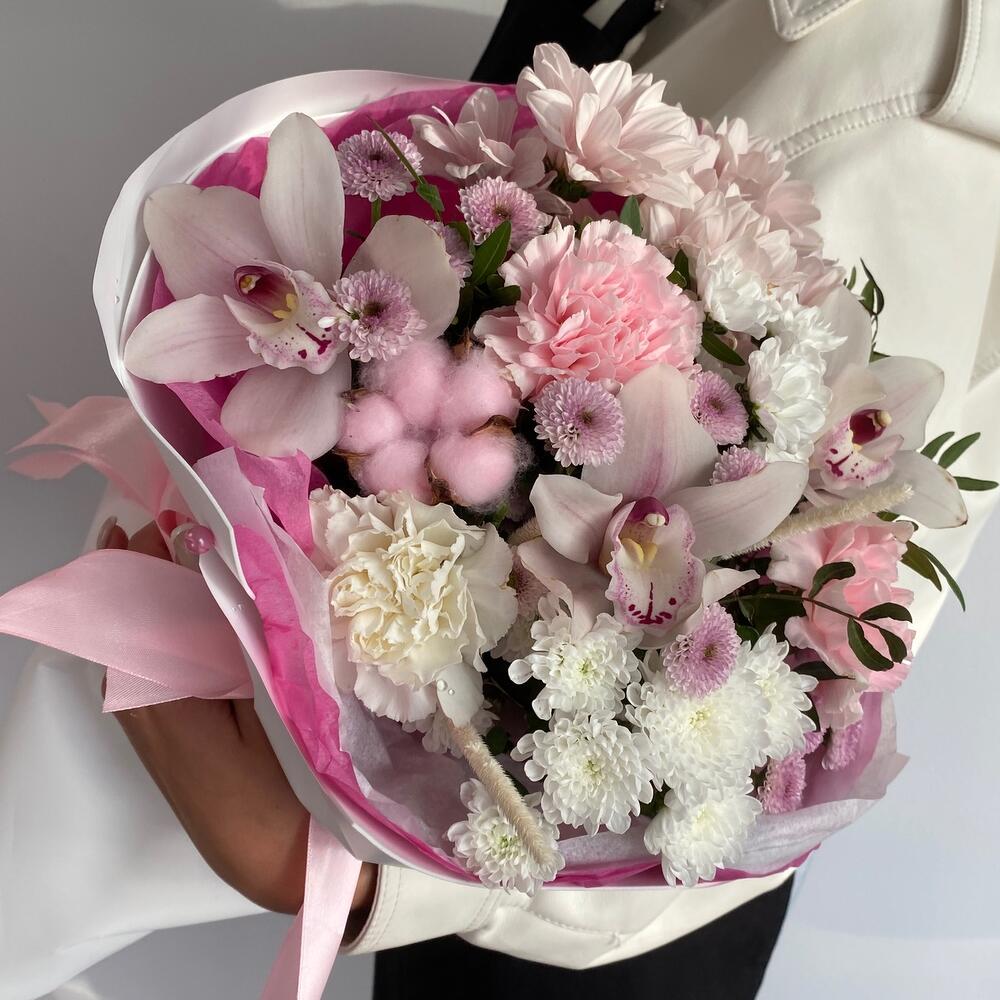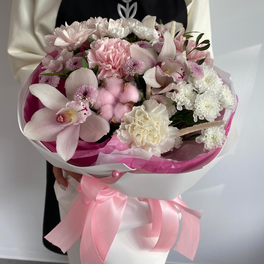 Орхидея Цимбидиум – 3 шт.Хлопок – 1 шт.Хризантема кустовая – 1 шт.Лента атласная – 2 шт.Сантини – 4 шт.Гвоздика сортовая – 3 шт.Пленка матовая – 3 шт.Фисташка пучок – 1 шт.тишь розовое – 3 шт.