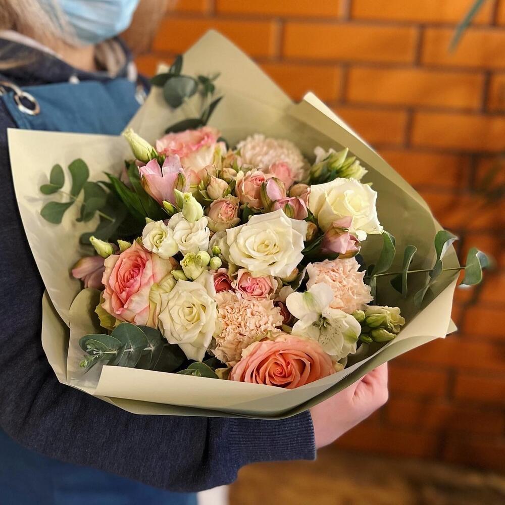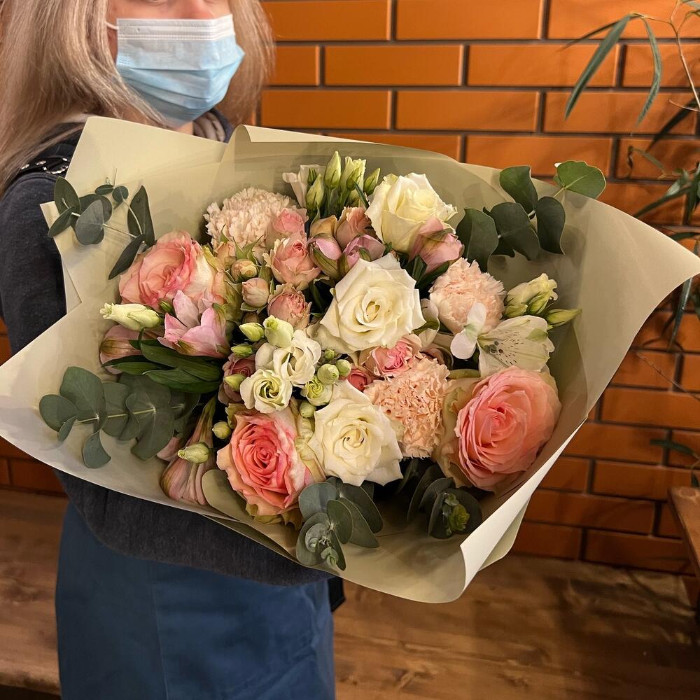 Роза одноголовая эквадор 50 см – 3 шт.Роза кустовая – 4 шт.Диантус сортовой – 3 шт.Альстромерия – 2 шт.Эустома – 3 шт.Эвкалипт – 4 шт.