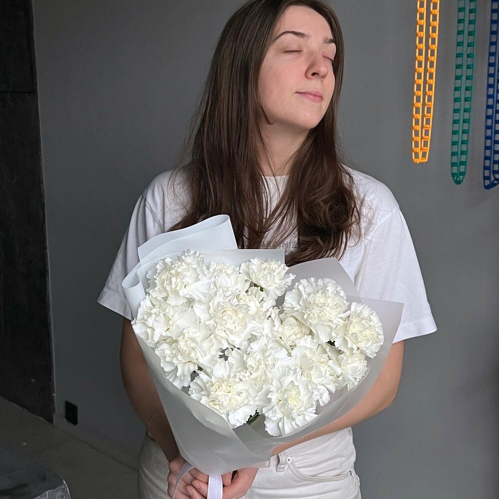 Гвоздика белая – 15 шт.Дизайнерская упаковка – 1 шт.Лента – 1 шт.