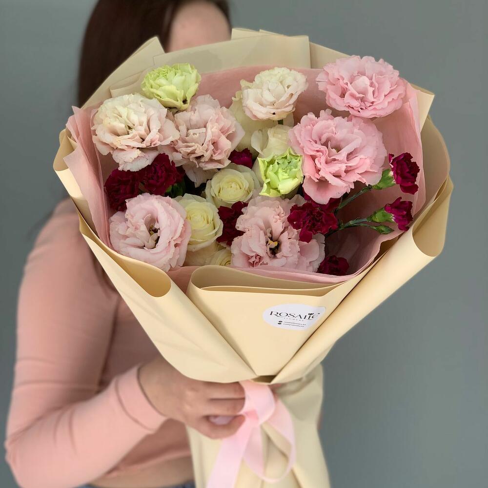 Альстромерии, Гвоздики, Кустовые розы, Лизиантусы, Розы, Хризантемы