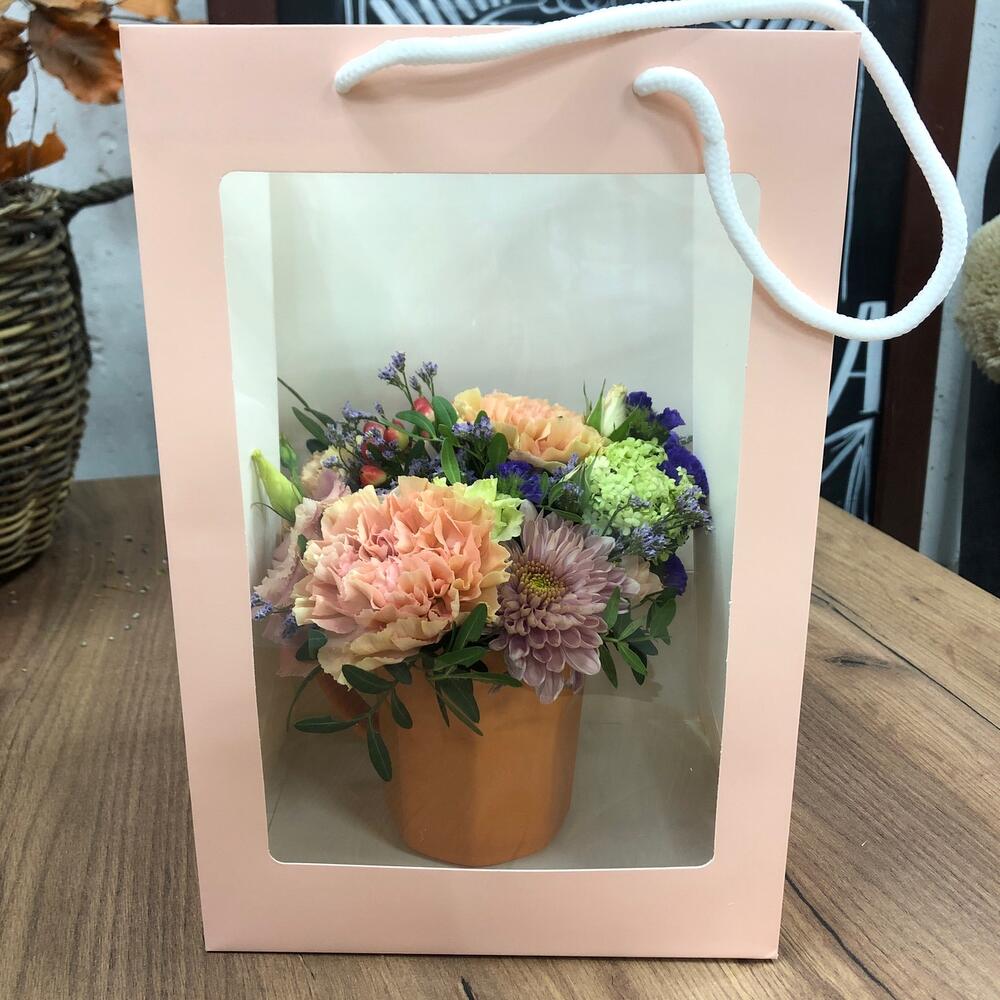 Яркая цветочная композиция в керамической кружке в подарочном пакете с окошком отличный готовый подарок