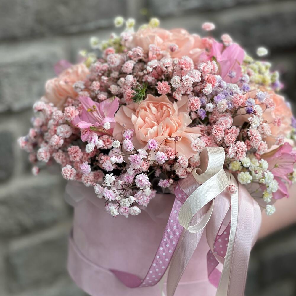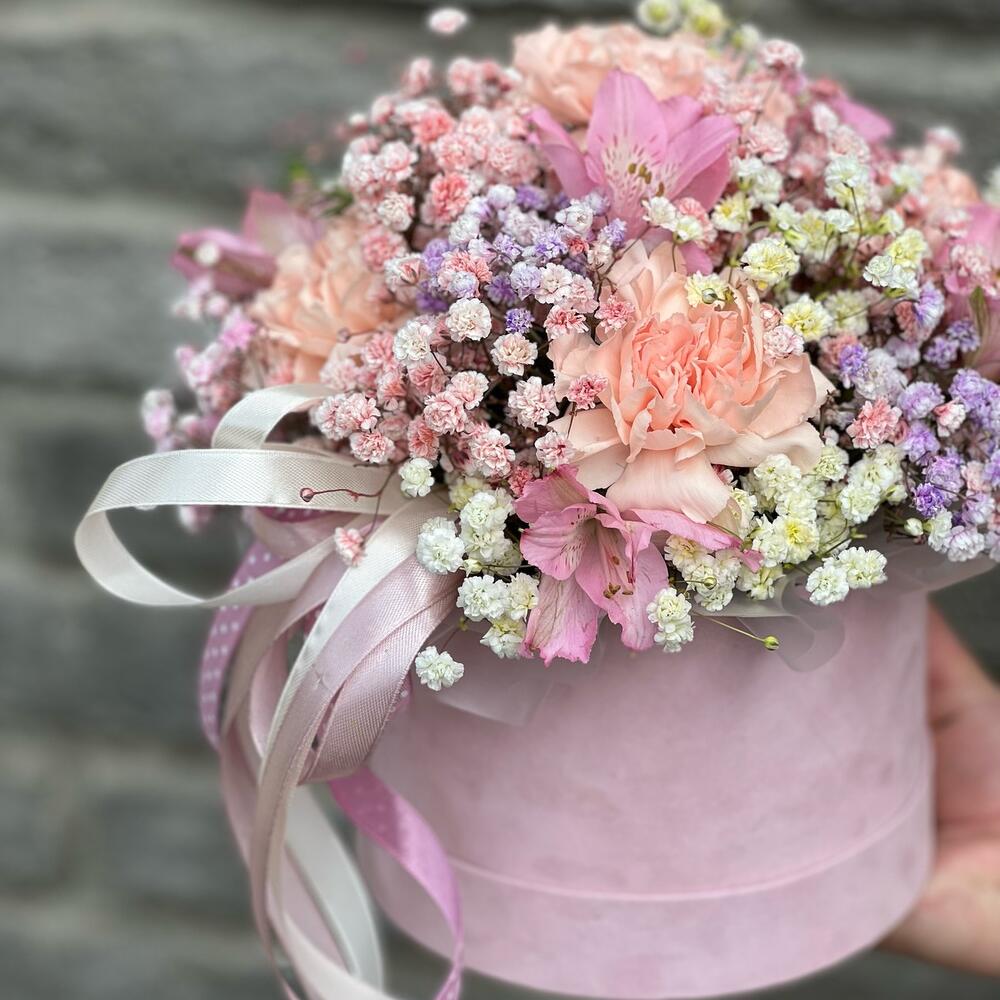 Диантус – 5 шт. Альстромерия – 2 шт. гипсофила радужная – 3 шт. Эвкалипт – 1 шт. Коробка шляпная – 1 шт. Лента атласная – 3 шт.