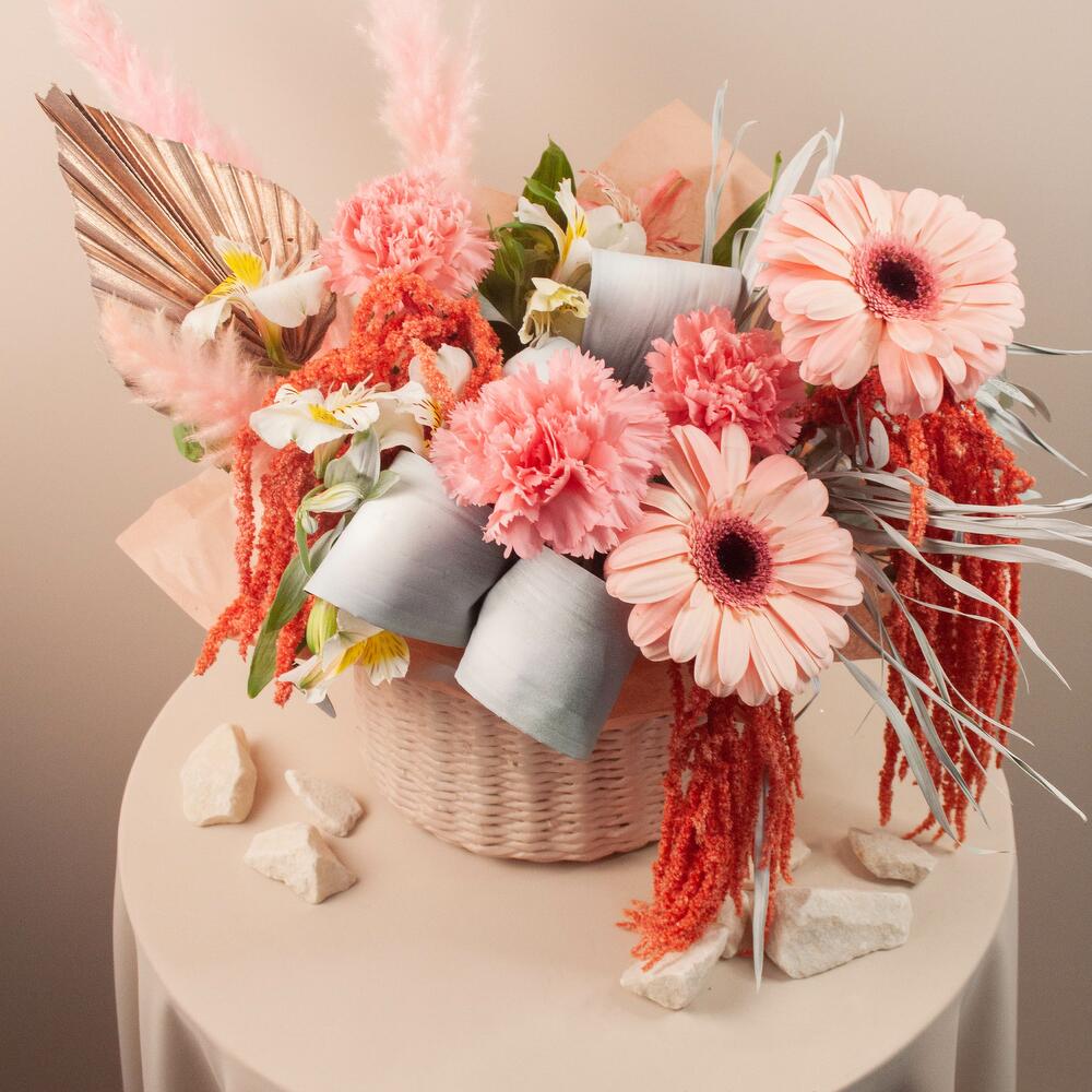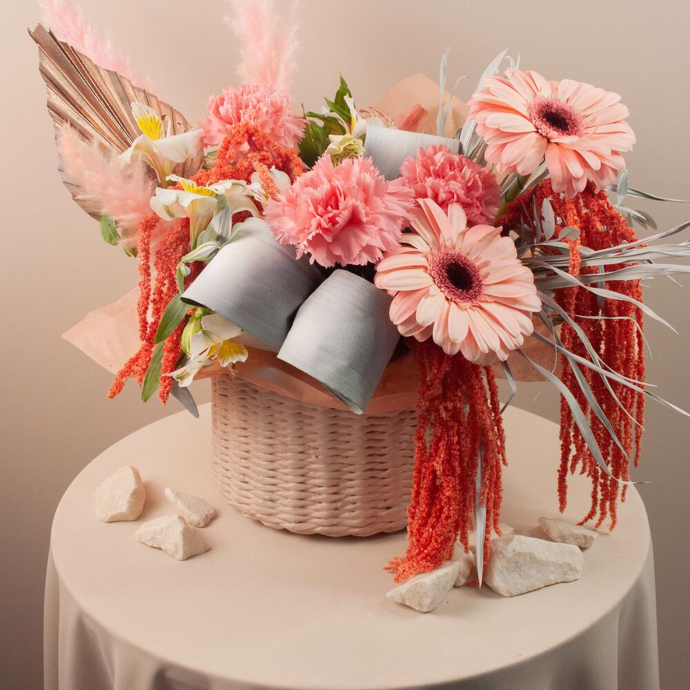 Альстромерии, Гвоздики, Кустовые розы, Лизиантусы, Розы, Хризантемы