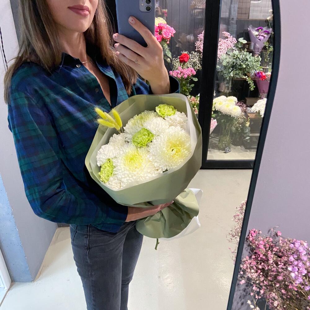 хризантема магнум белая – 3 шт.Гвоздика зеленая – 3 шт.гвоздика белая сортовая – 5 шт.Лагурус (сухоцвет) – 4 шт.