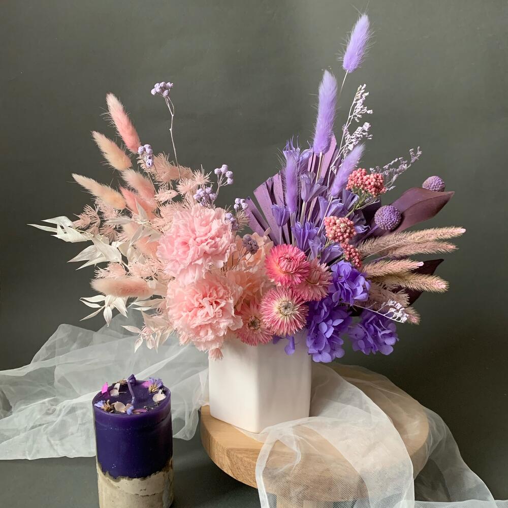 Кашпо керамическое – 1 шт.пальма пика – 1 шт.листья магнолии крашенные – 3 шт.Краспедия – 3 шт.гвоздика стабилизированная – 2 шт.Гелихризум – 4 шт.иглица стабилизированная – 1 шт.Лагурус – 20 шт.Лимониум – 3 шт.пижма крашеная ветка – 2 шт.аспарагус стабилизированный – 4 шт.гортензия стабилизированная розовая – 2 шт.гортензия стабилизированная фиолетовая – 4 шт.Хлопок – 1 шт.Озотамнус розовый – 5 шт.Нигелла сухоцвет – 8 шт.Оазис флористический – 1 шт.колосья крашенные – 6 шт.пленка прозрачная упаковочная – 1 шт.крафт пакет с ручками – 1 шт.