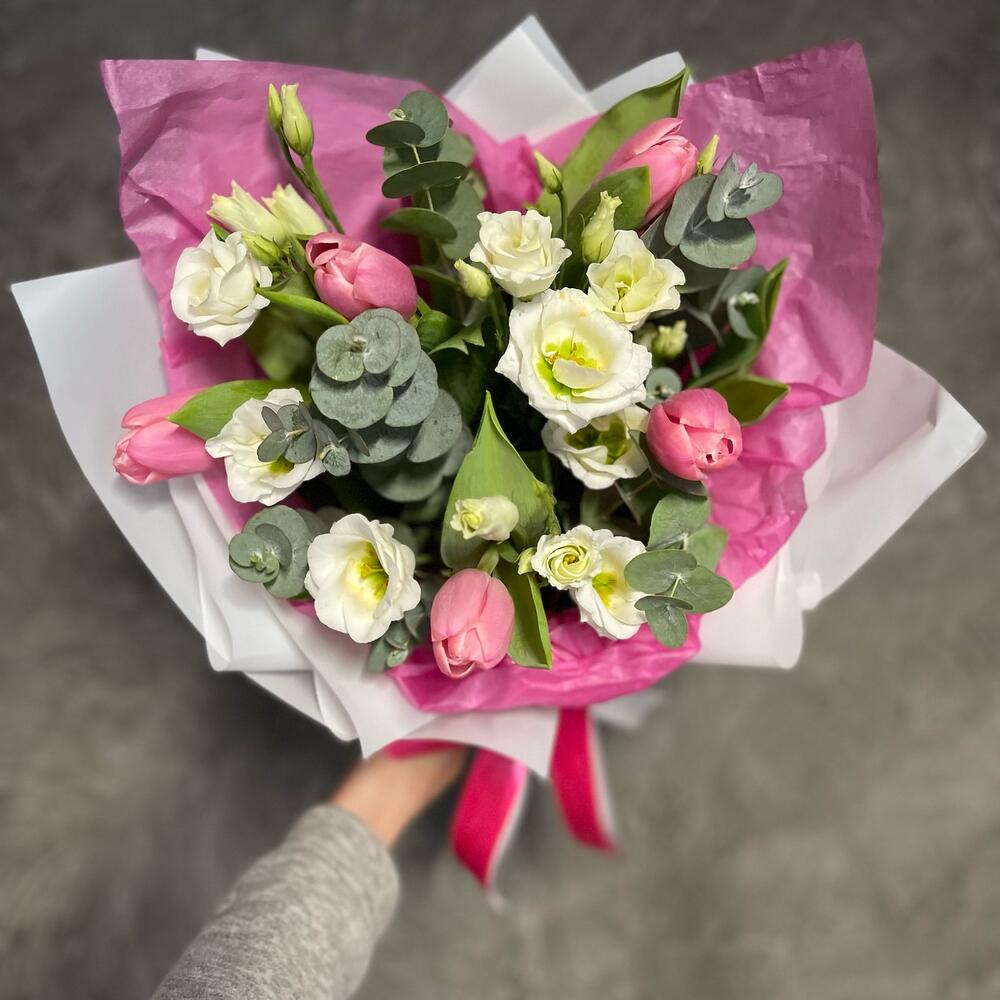 Тюльпан – 5 шт.Ваксфлауэр – 1 шт.Диантус кустовой – 7 шт.Эвкалипт Baby Blue – 15 шт.Упаковка дизайнерская – 2 шт.Лента атласная – 2 шт.