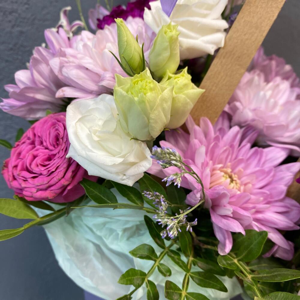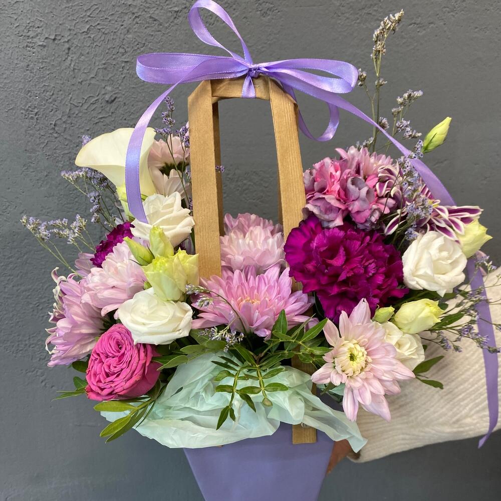 Хризантема кустовая – 2 шт.Эустома – 2 шт.Лента атласная – 1 шт.Диантус – 3 шт.Фисташка – 1 шт.Сумочка – 1 шт.Лимониум сиреневый – 2 шт.Оазис флористический – 1 шт.