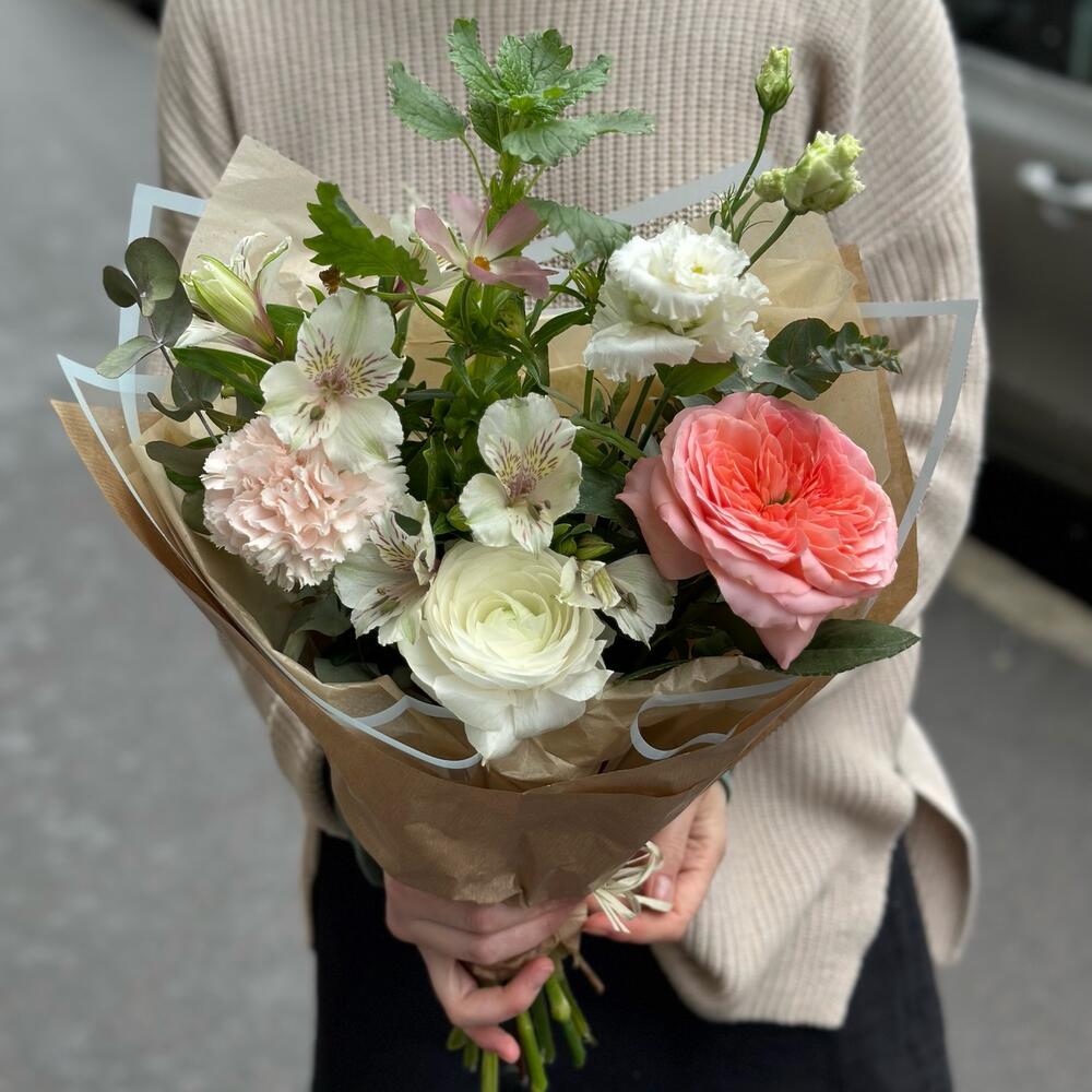 пионовидная роза мандарин – 1 шт.Ранункулюс – 1 шт.Альстромерия – 2 шт.кустовой ранункулюс – 1 шт.малючелла – 1 шт.Эвкалипт Микс – 1 шт.Эустома – 1 шт.Диантус – 1 шт.Дизайнерская упаковка – 1 шт.