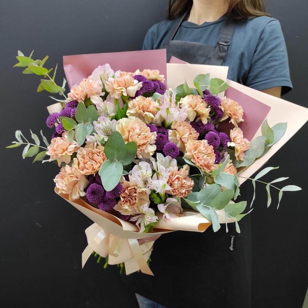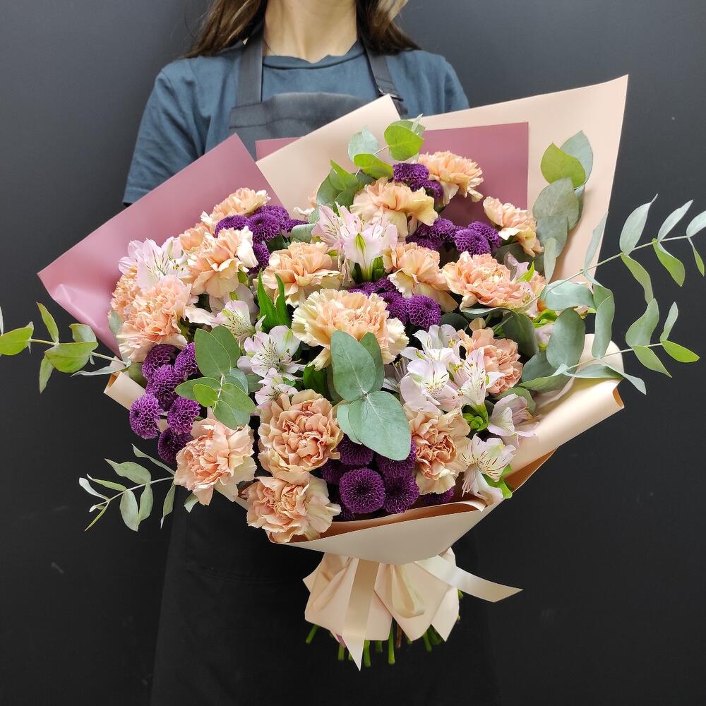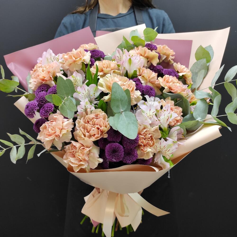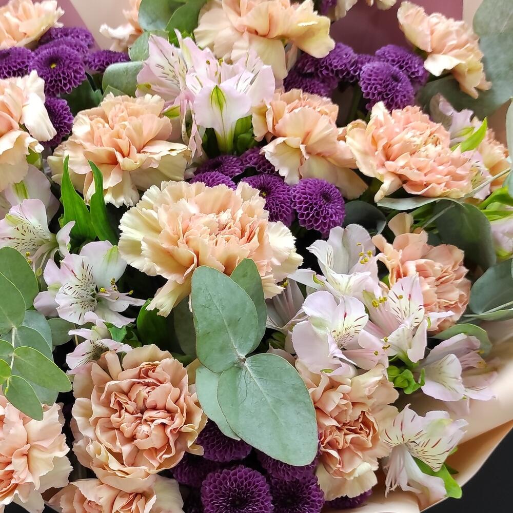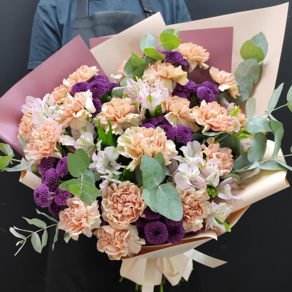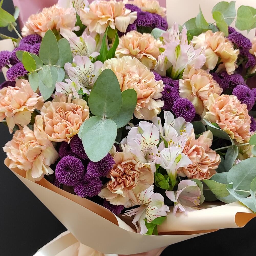 Гвоздики, Лизиантусы, Розы, Тюльпаны