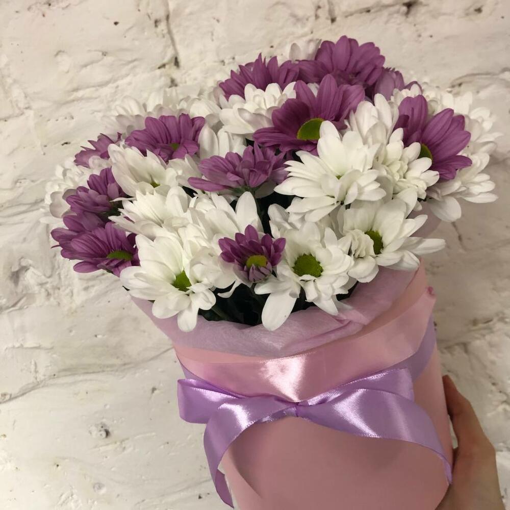 Хризантема кустовая розовая – 2 шт.Хризантема кустовая белая – 3 шт.Шляпная коробка – 1 шт.Лента атласная – 1 шт.Оазис – 1 шт.