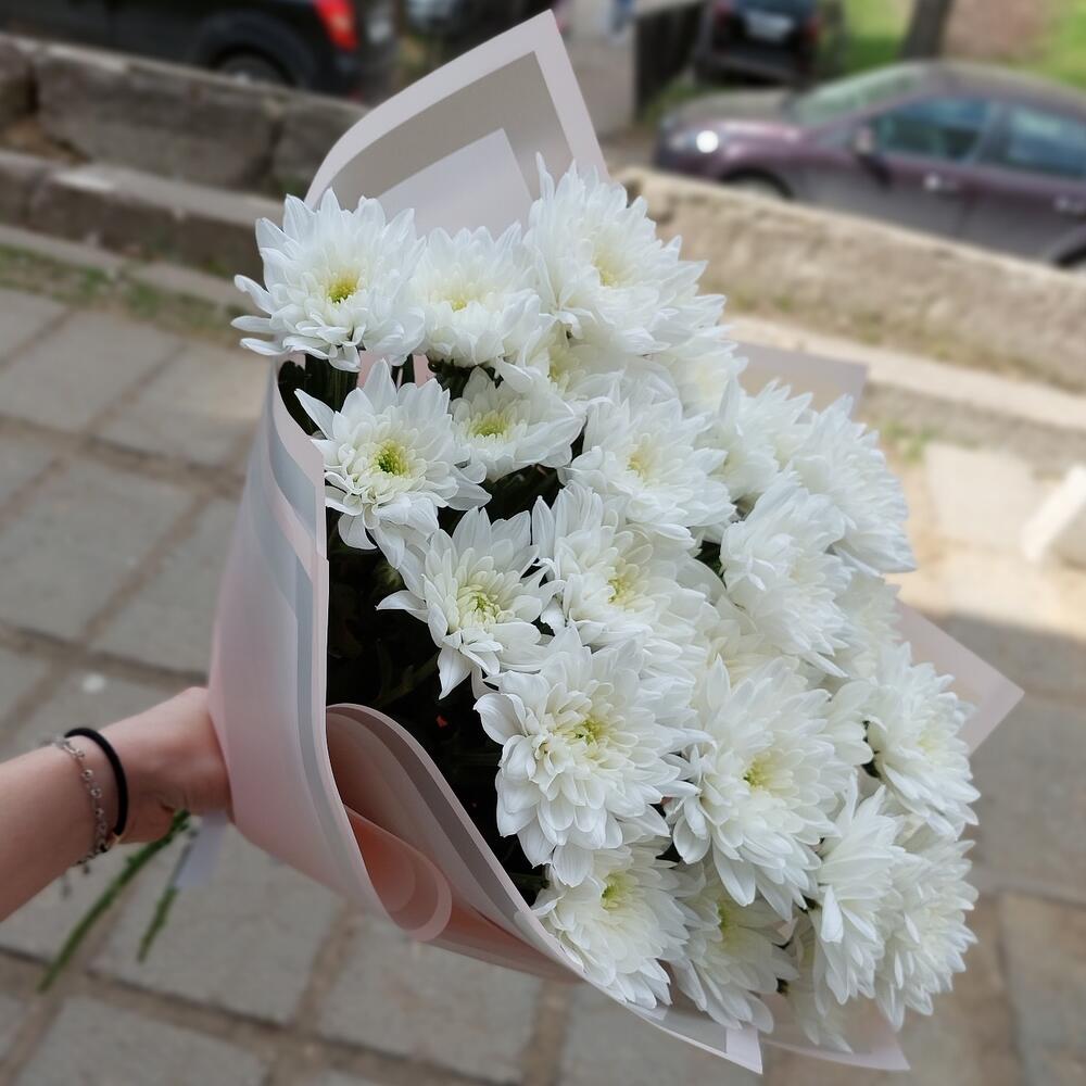 Хризантема кустовая – 5 шт.Упаковка дизайнерская – 1 шт.Лента атласная – 1 шт.