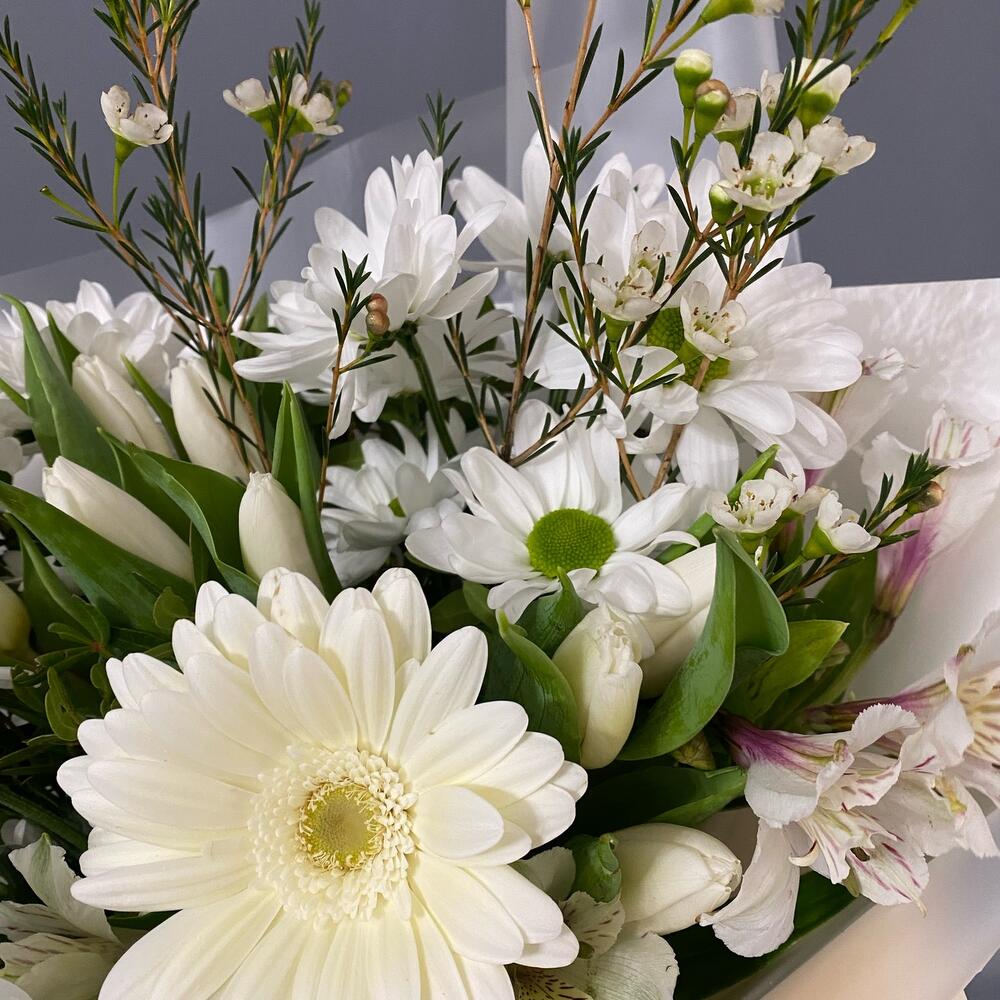 Букет с тюльпанами, герберами, альстромерией и хризантемой ромашка «Ванильная весна»