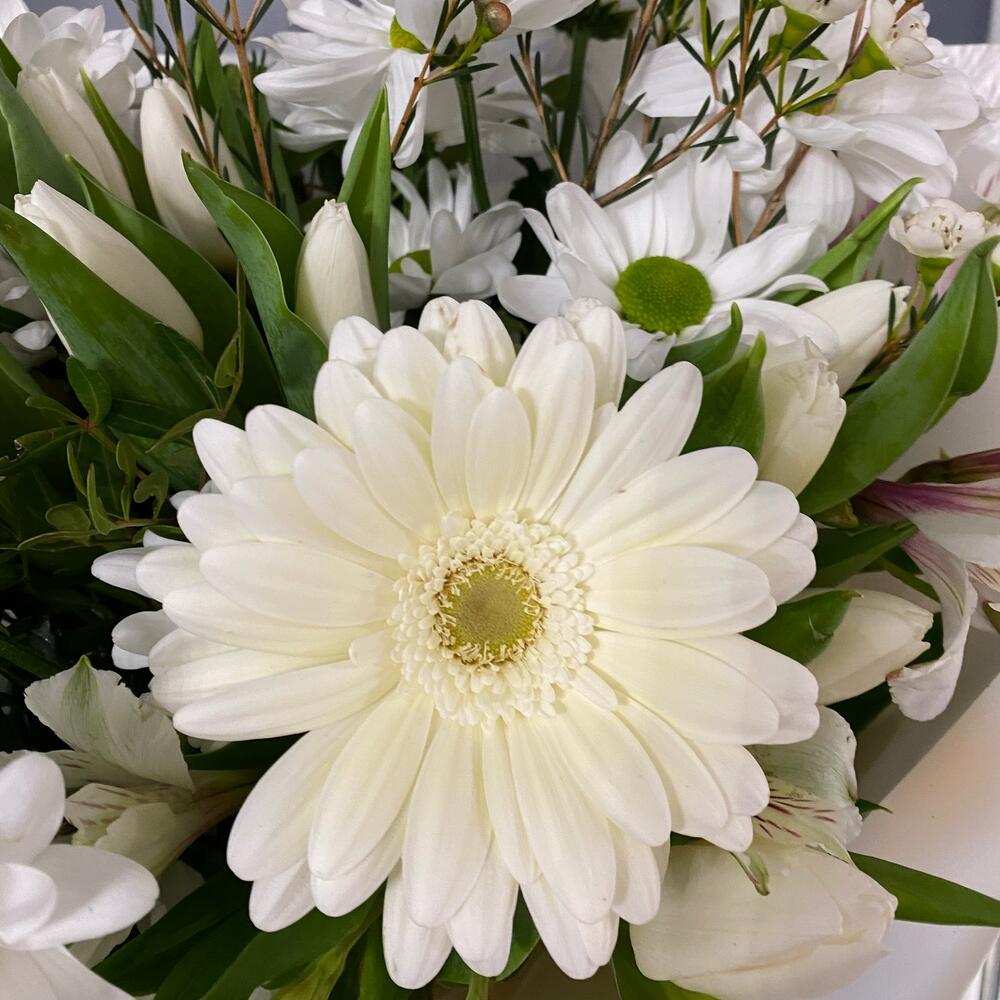 Хризантема кустовая – 3 шт.Гербера – 2 шт.Тюльпан Голландский – 9 шт.Альстромерия Микс Европа – 3 шт.Дизайнерская упаковка – 1 шт.Хамелациум белый – 3 шт.Салал пучок – 1 шт.