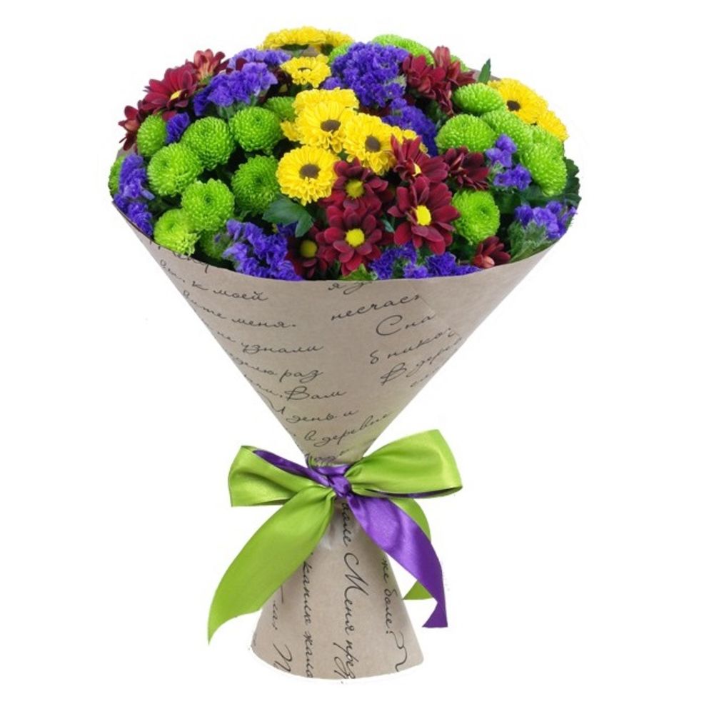 лента декоративная – 1 шт.бумага упаковочная – 1 шт.Статица синяя – 3 шт.Хризантема сантини желтая – 3 шт.Хризантема сантини зеленая – 3 шт.хризантема сантини красная – 3 шт.