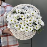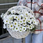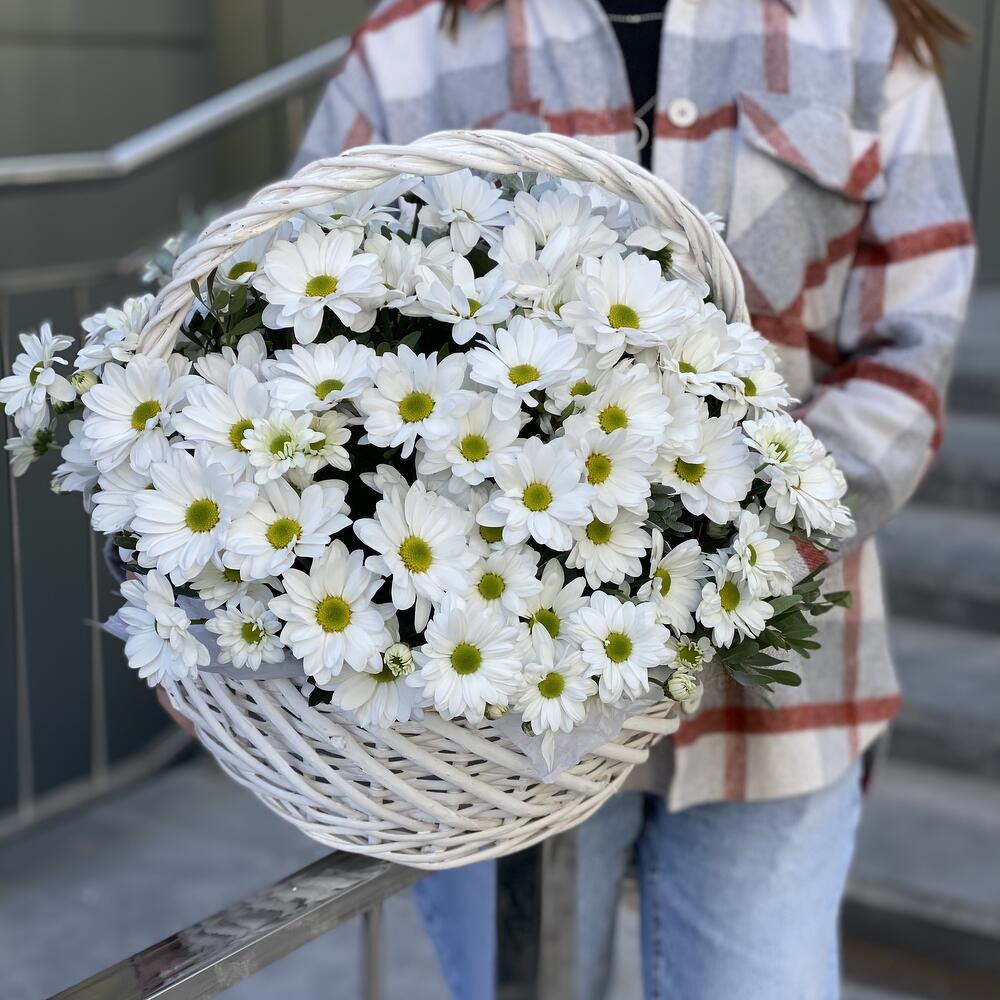 хризантема белая ромашковая – 11 шт. Писташ – 5 шт. Корзина – 1 шт. Оазис – 2 шт. Оформление – 1 шт.