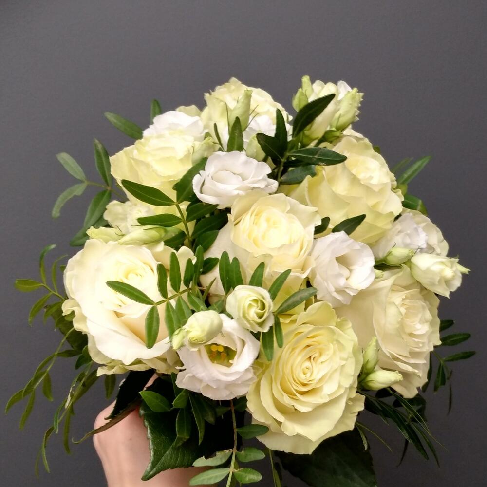 Букет невесты из белых роз и лизиантуса