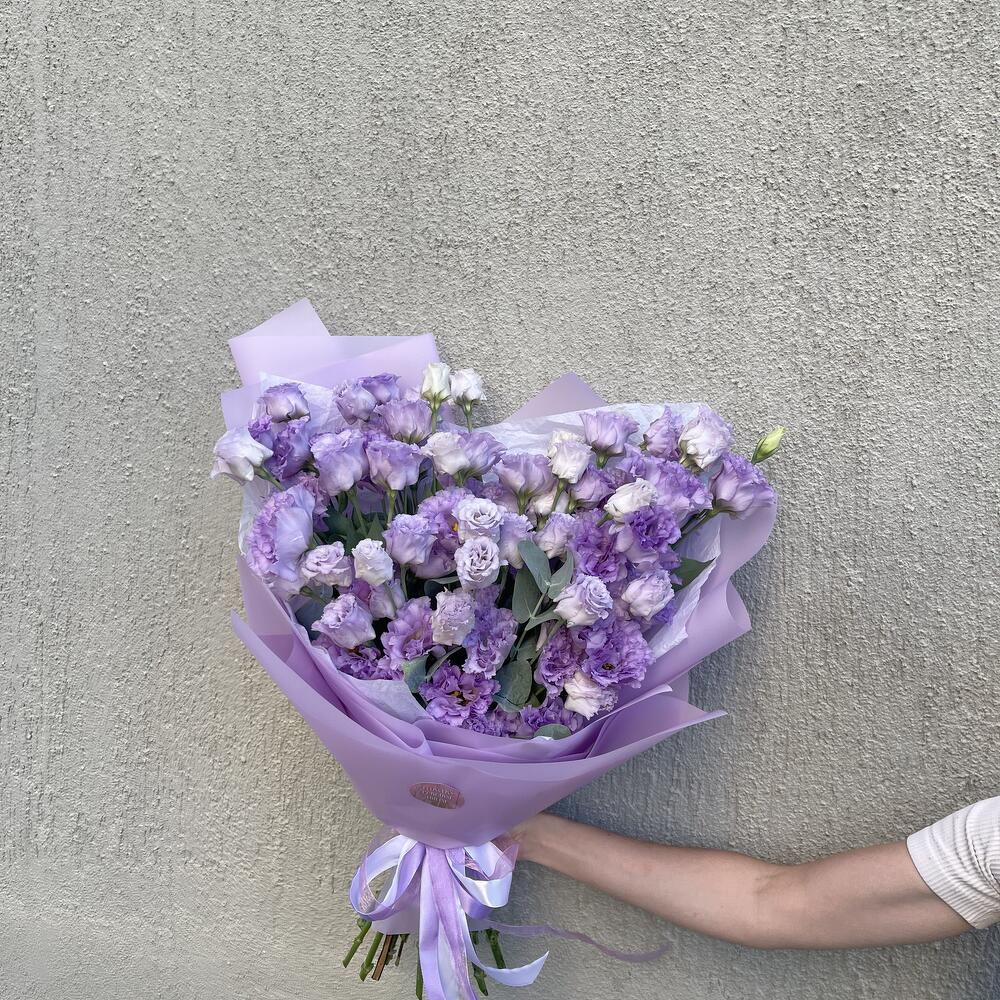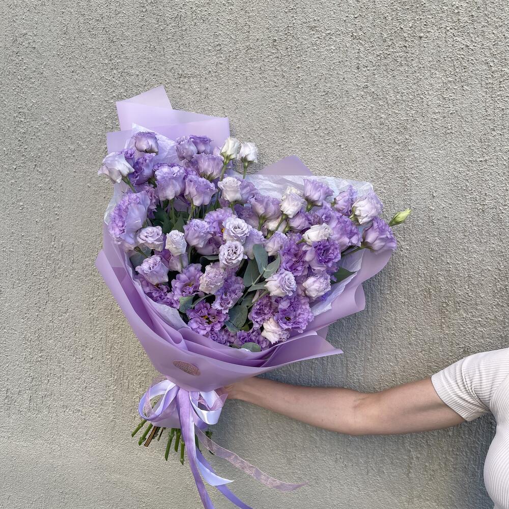 эустома (веток) – 15 шт. флористическая зелень (веток) – 3 шт. Упаковка – 1 шт. Атласная лента – 1 шт.