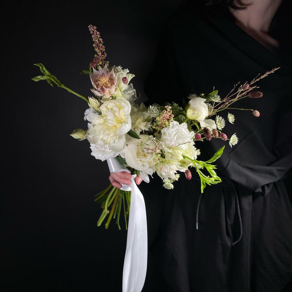 Букет с пионовидными тюльпанами,пионовидной розой и пионами